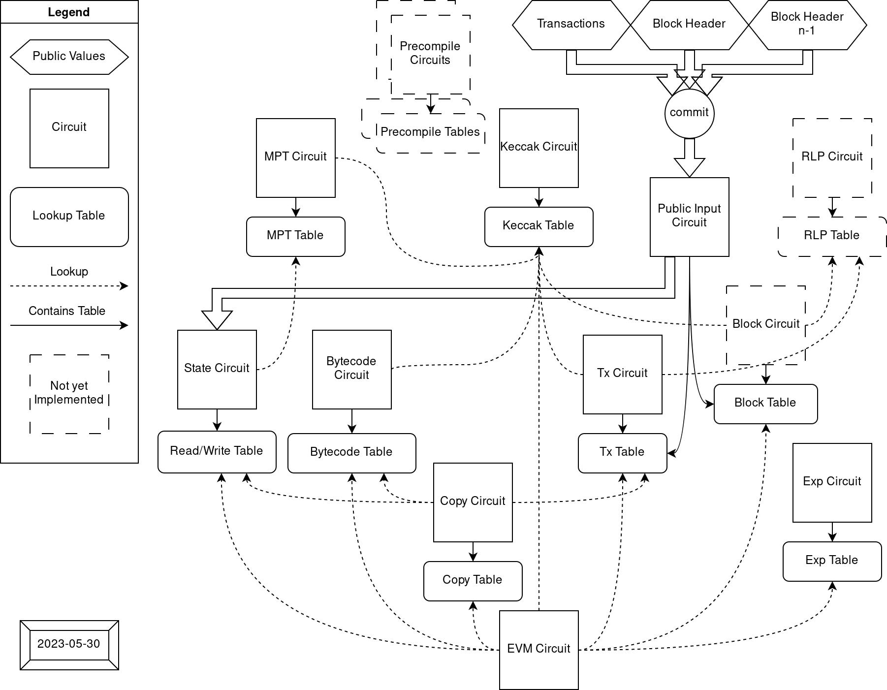 Each circuit is layouted to be capable to build their own custom constraints. When circuits encounter some expensive operations, they can outsource the effort to other circuits through the usage of lookup arguments. The relationship between circuits looks like: