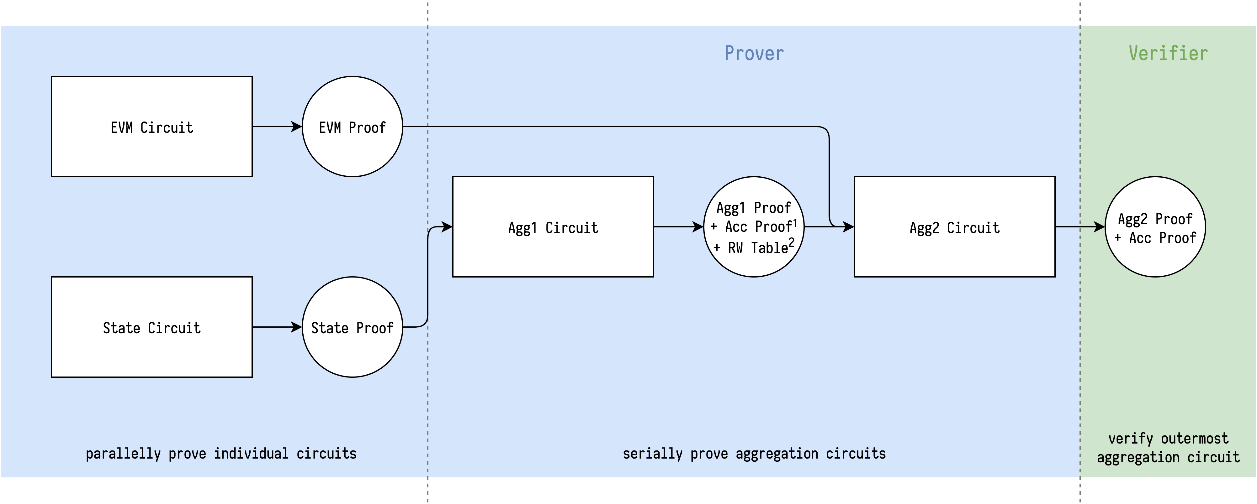 In order to reduce the time required to build a proof of a full block and to simplify the verification step, an aggregation circuit is being build so that condenses the verification of each sub-circuit proofs shown in the diagram. See Design Notes, Recursion for details on the recursion strategy used in the aggregation circuit.