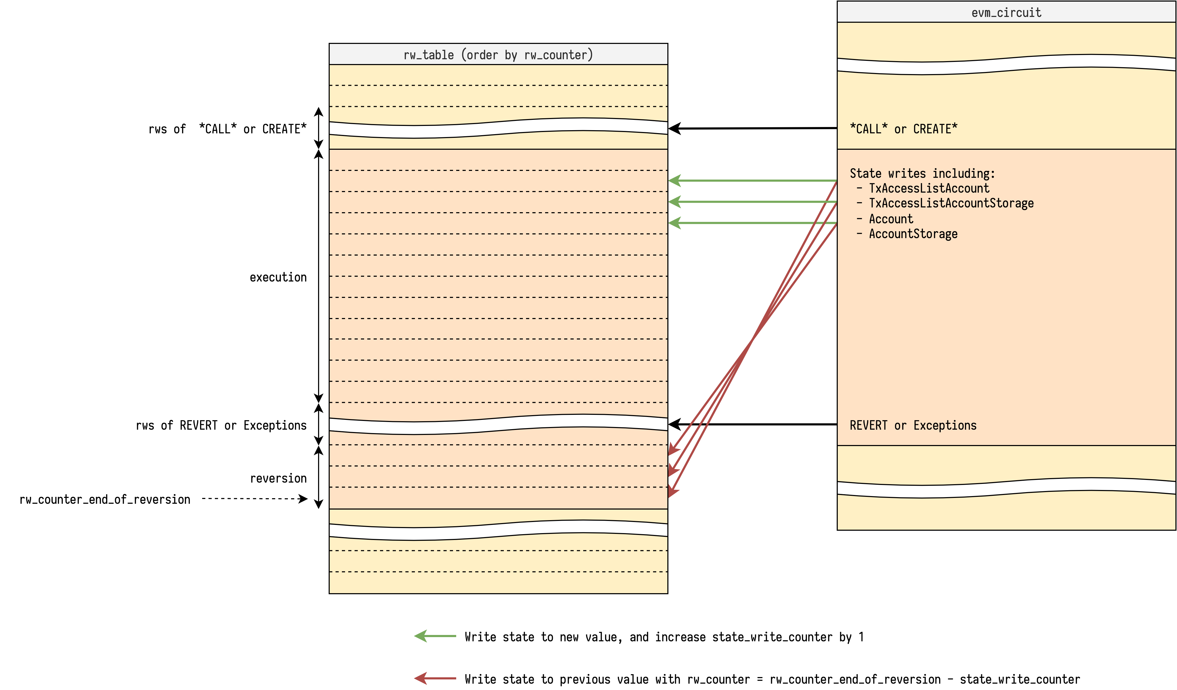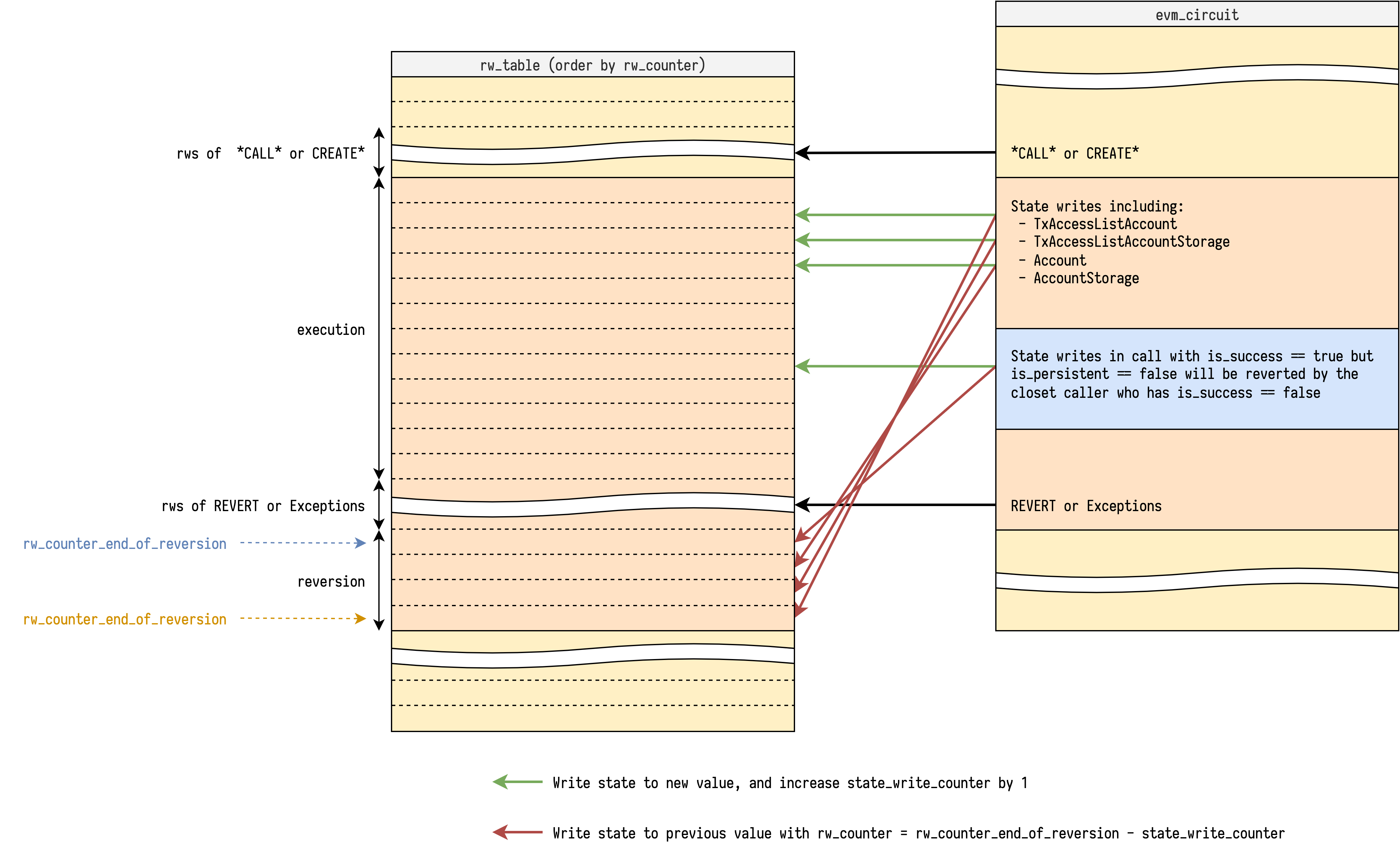 Reversible write reversion might be the most tricky part to explain of the EVM circuit. This note aims to illustrate how the current approach works with some diagrams, and collect all the other approaches for comparison.